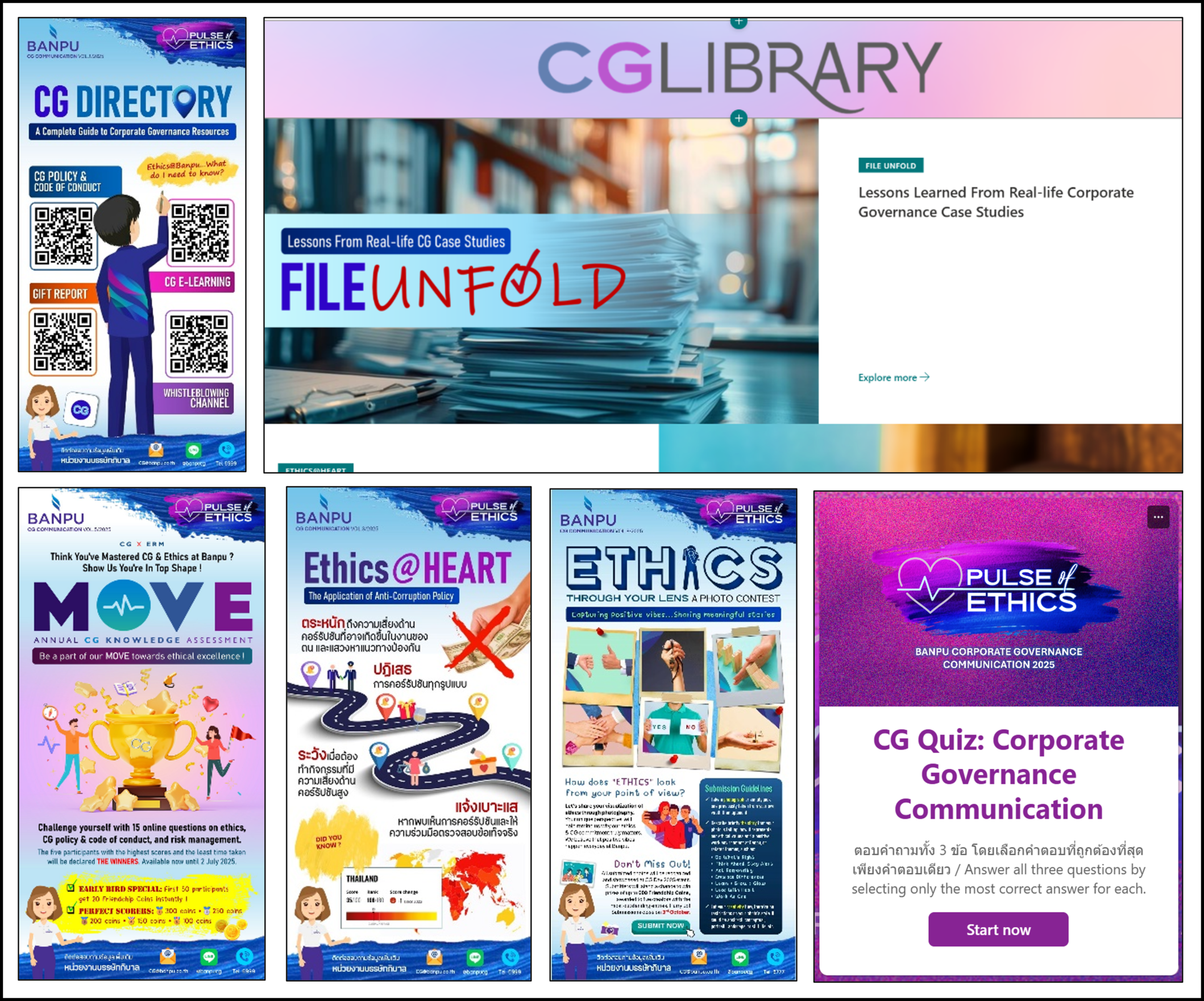 บริษัทฯ จัดให้มีกิจกรรมการสื่อสารเพื่อสร้างการมีส่วนร่วมในรูปแบบต่างๆ เช่น การอ่านกรณีศึกษา การรับชมสื่อวิดีทัศน์ การตอบคำถามชิงรางวัล การประกวดภาพถ่าย การแข่งขันความรู้ด้านบรรษัทภิบาลประจำปี ฯลฯ เพื่อนำเสนอข้อมูลแนวปฎิบัติที่ดีด้านการกำกับดูแลกิจการ ตลอดจนส่งเสริมวัฒนธรรมองค์กรด้านบรรษัทภิบาลภายในองค์กร ภายใต้แนวคิด “Pulse of Ethics” โดยในปี 2568 บริษัทฯ มุ่งเน้นการปลูกฝังทัศนคติและการตัดสินใจเชิงจริยธรรม ตลอดจนสร้างความตระหนักแก่บุคลากรทุกระดับถึงแนวปฏิบัติที่ดีตามหลักจริยธรรมธุรกิจของบริษัทฯ นอกจากนี้ หน่วยงานบรรษัทภิบาลยังได้จัดให้มี CG Library ผ่าน Internal Portal ขององค์กร เพื่อใช้เป็นแหล่งรวบรวมนโยบายและแนวปฏิบัติต่างๆ ที่เกี่ยวข้อง ตลอดจนข้อมูลข่าวสารด้านการกำกับดูแลกิจการที่ดีของบริษัทฯ ที่กรรมการ ผู้บริหาร และพนักงานทั่วทั้งองค์กร สามารถเข้าถึงและสืบค้นได้ตามความสนใจ