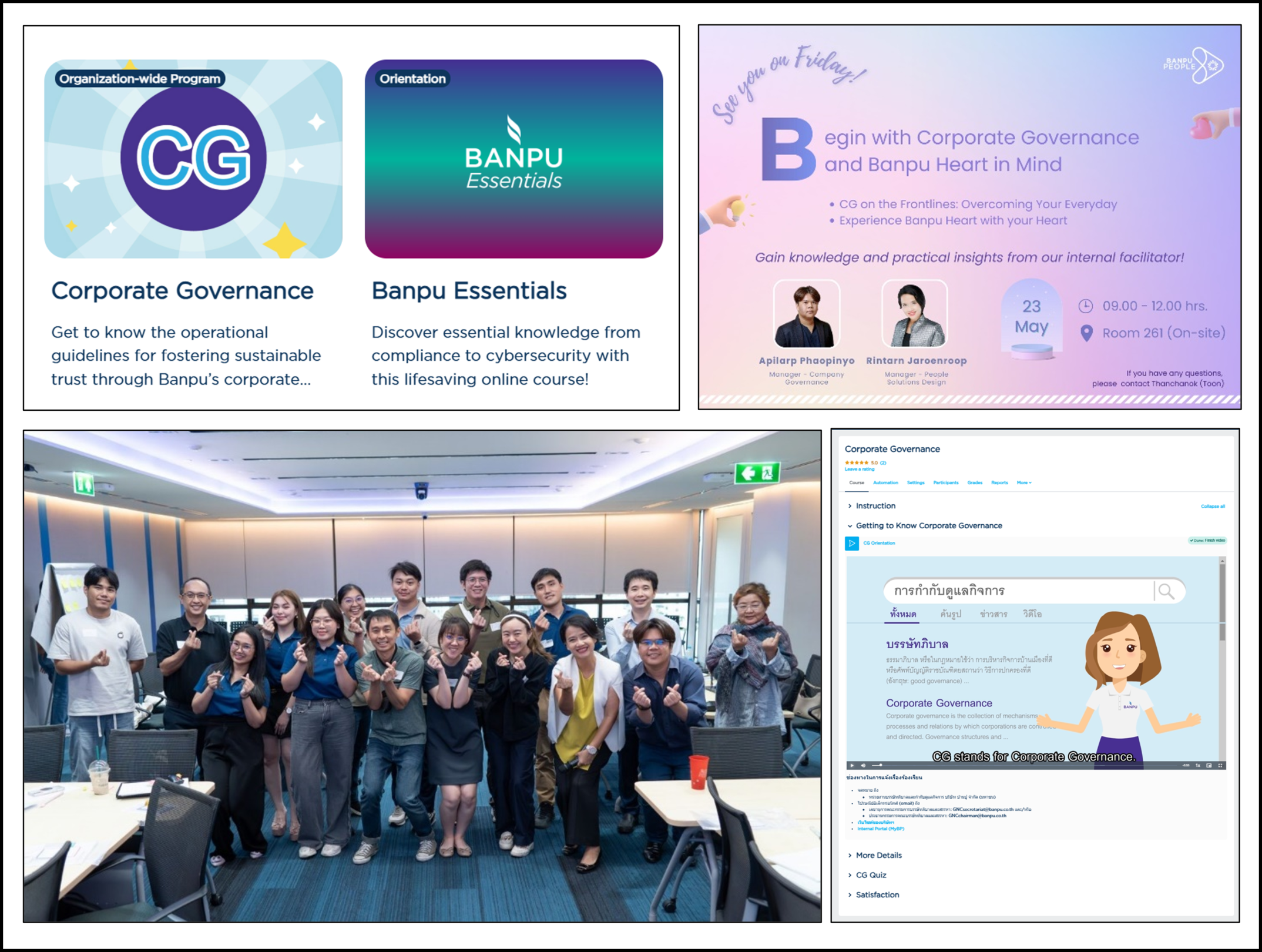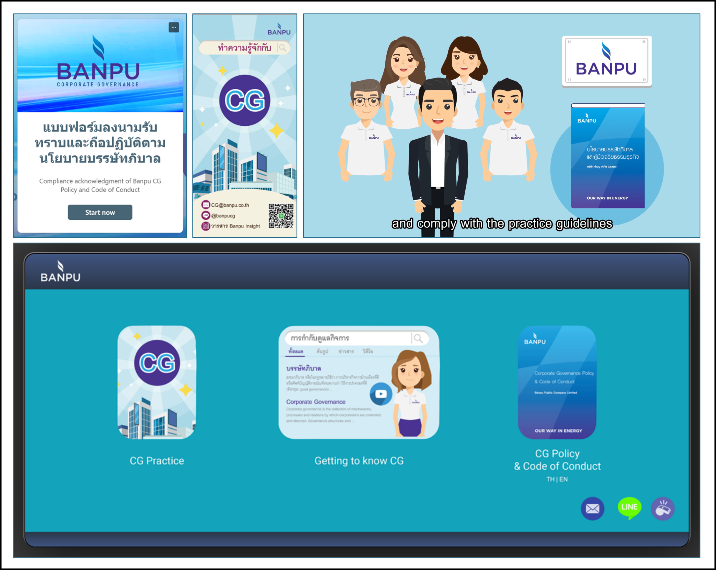 หน่วยงานบรรษัทภิบาล และ Banpu Academy ร่วมพัฒนาระบบ CG E-learning and E-testing โดยมีวัตถุประสงค์เพื่อวัดความเข้าใจ และส่งเสริมความรู้และการปฏิบัติของพนักงานให้เป็นไปตามนโยบายบรรษัทภิบาลและคู่มือจริยธรรมธุรกิจผ่านระบบ E-learning บนแพลตฟอร์ม B SUCCESS ซึ่งเป็นระบบการจัดการเรียนรู้ของบริษัทฯ