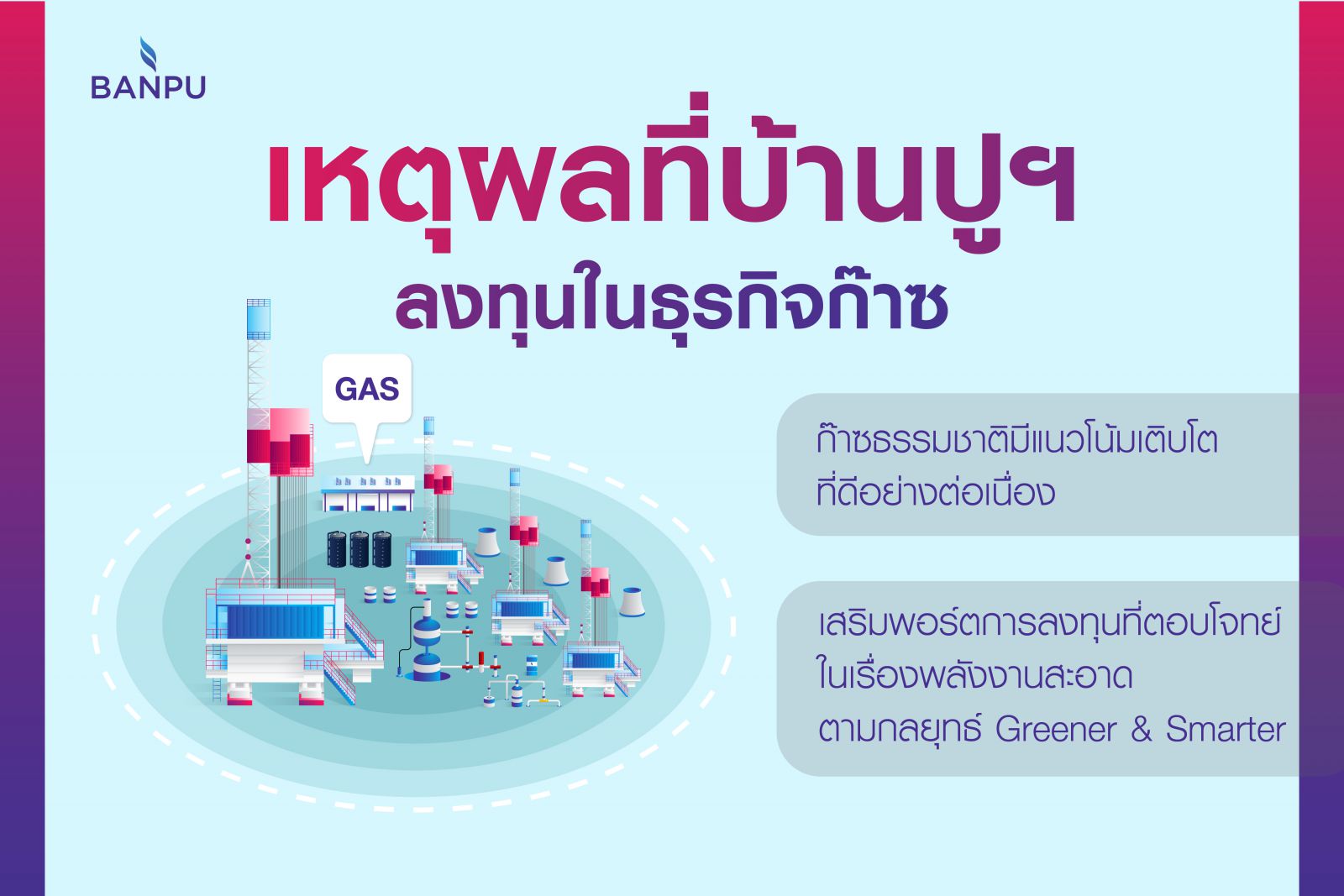 นางสมฤดี ชัยมงคล ประธานเจ้าหน้าที่บริหาร บริษัท บ้านปู จำกัด (มหาชน) กล่าวว่า “ก๊าซธรรมชาติเป็นเชื้อเพลิงที่มีความยืดหยุ่นในการใช้งาน เพราะเป็น bridging fuel หรือเชื้อเพลิงที่เป็นตัวเชื่อมสำคัญในช่วงที่มีการเปลี่ยนผ่านจากพลังงานเชื้อเพลิงที่ต้นทุนต่ำไปสู่การใช้พลังงานหมุนเวียนในอนาคต นอกจากธุรกิจก๊าซธรรมชาติจะสอดคล้องกับกลยุทธ์ Greener & Smarter ของบริษัทฯ แล้ว ยังเป็นธุรกิจที่เติบโตได้ดีจากความต้องการใช้ก๊าซธรรมชาติที่มีแนวโน้มสูงขึ้นในระยะยาวไปจนถึงปี 25931 บ้านปูฯ จึงไม่หยุดนิ่งในการแสวงหาโอกาสในการลงทุนในธุรกิจนี้อย่างต่อเนื่องและเลือกลงทุนในจังหวะที่เหมาะสม เพื่อสร้างรายได้จากธุรกิจก๊าซธรรมชาติอย่างสม่ำเสมอ และเพิ่ม EBITDA จากธุรกิจก๊าซธรรมชาติในพอร์ตของบริษัทฯ ให้เติบโตขึ้นอย่างมีนัยสำคัญ