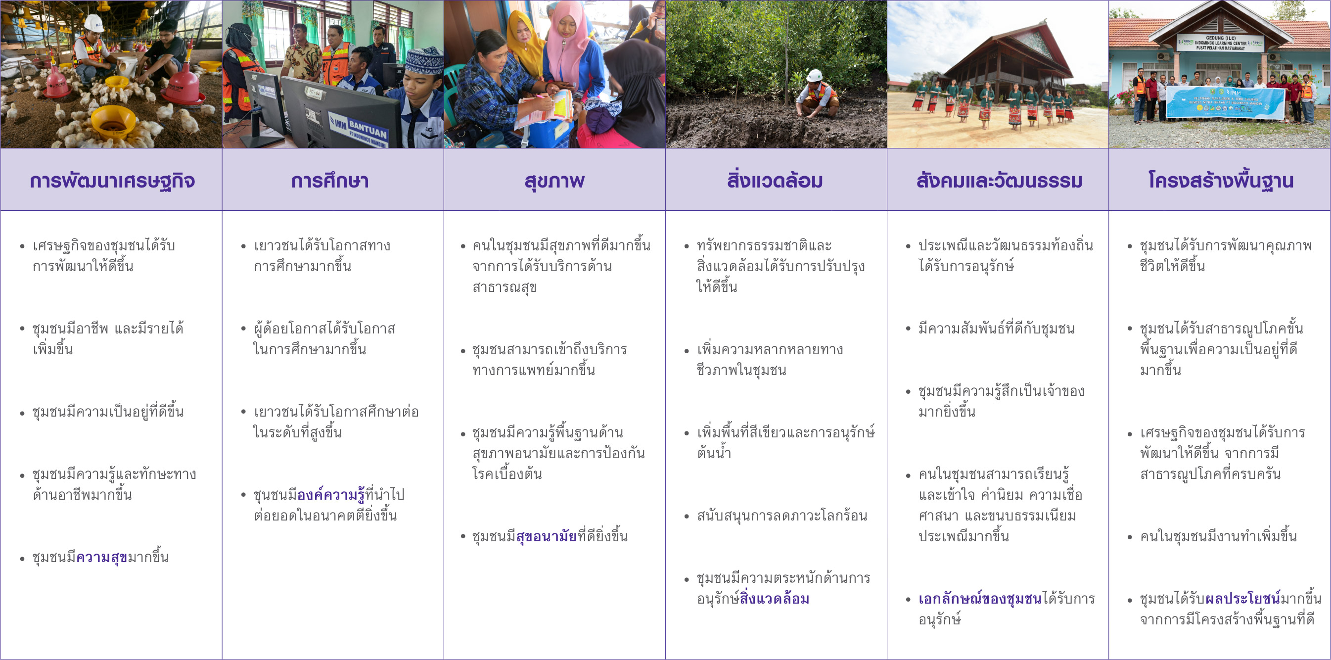 Engagement) ที่ครอบคลุมแนวทางการพัฒนาคุณภาพชีวิตของคนในชุมชนและการลดผลกระทบต่อสังคมและชุมชน ซึ่งทำให้ผู้ปฏิบัติงานด้านการพัฒนาชุมชนมีแนวทางการปฏิบัติที่ชัดเจน และเป็นมาตรฐานเดียวกันในทุกพื้นที่